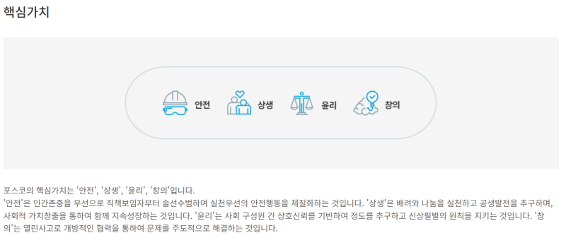 • 핵심가치: 안전, 상생윤리, 도전, 고객지향, 인간존중