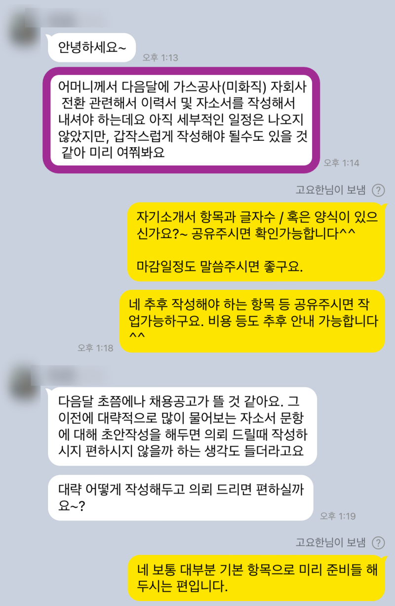 - ▶️ 자료 공유: 지원하실 공고문, 직무기술서, 이력서, 기존 자기소개서 초안 등 필요한 자료를 공유해 주세요.