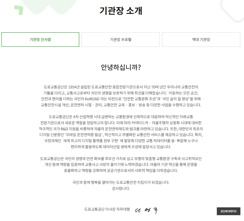 • ✔ 비전: ‘안전한 도로, 행복한 국민을 위한 모빌리티 리더’를 지향하며, 선진 교통 문화 구축에 기여합니다.