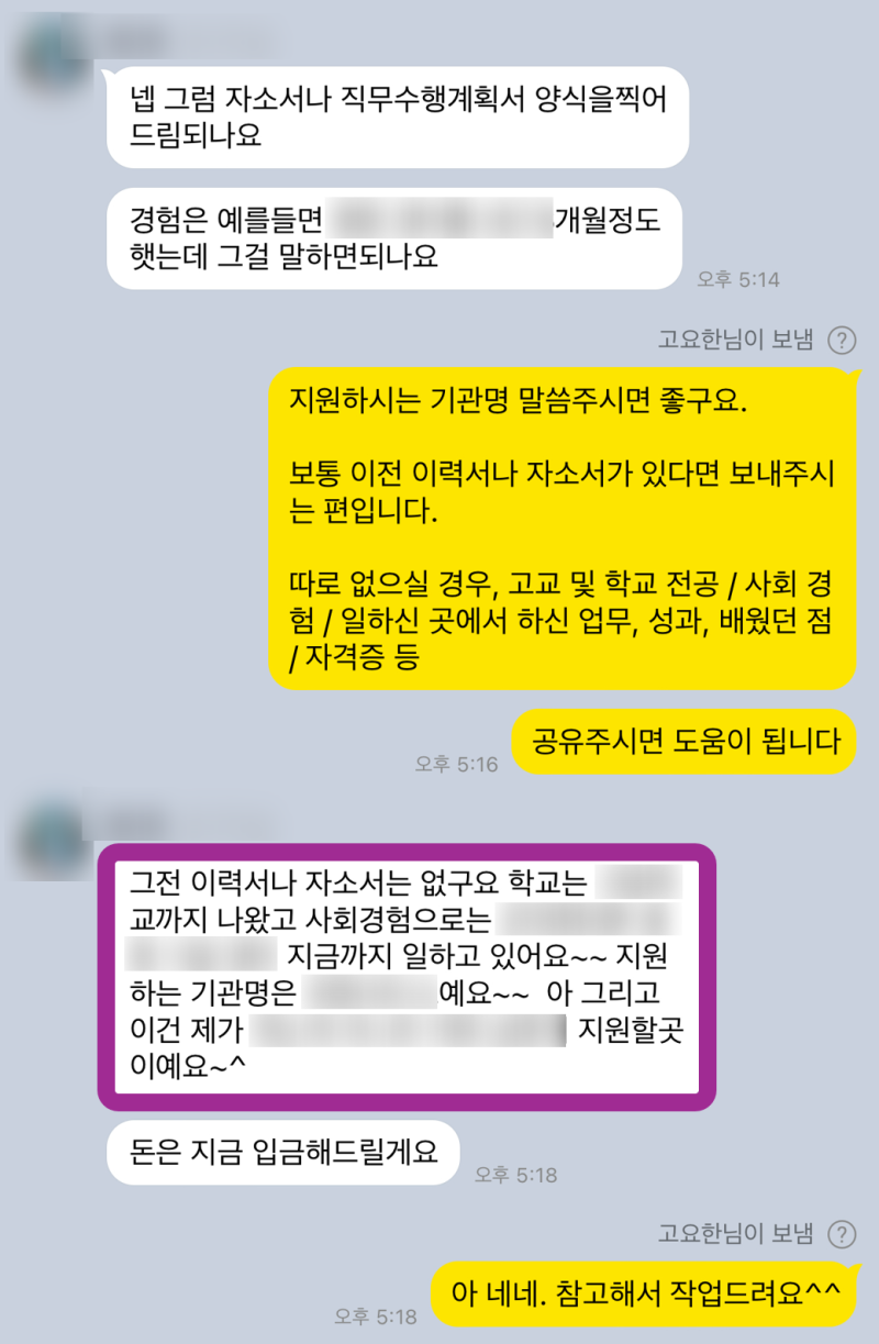 >> 상담 문의 및 자료 공유: 지원하는 채용공고, 본인의 이력서, 작성하신 자기소개서 초안(혹은 성장 배경 등 기본 정보)을 공유해 주세요.