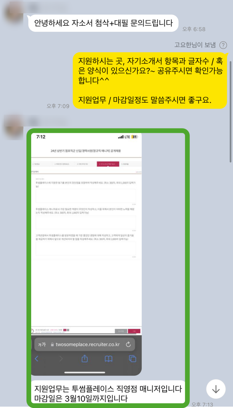 저는 1. 자기소개서 첨삭 및 대행 2. 학업계획서 3. 경력기술서 및 직무수행계획서 진행 4. 면접컨설팅까지 폭넓은 서비스를 제공하며, 각 개인의 빛나는 강점을 가장 효과적으로 어필할 수 있도록 전략을 제시해드립니다. 이번 투썸플레이스 직영점 매니저 지원자분과의 작업 과정에서 제가 직접 첨삭/대필하면서 얻은 노하우와 그 과정을 아낌없이 풀어드리겠습니다! 🎁