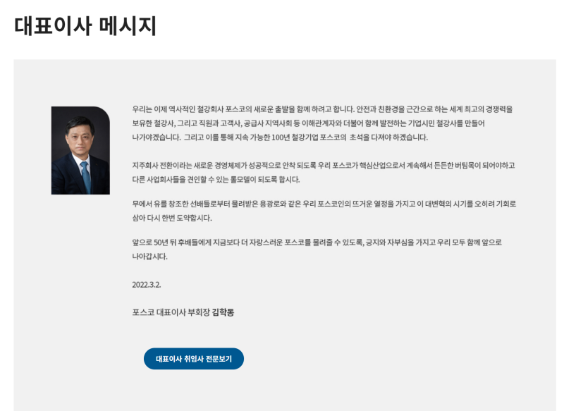• 비전: Green Tomorrow With POSCO (미래를 여는 친환경 소재 대표기업)