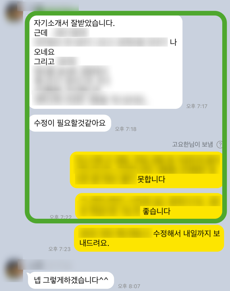 - >> 4단계: 1차 초안 작성 또는 첨삭 진행 (지원자분과의 심도 깊은 소통으로 글의 뼈대 구성)