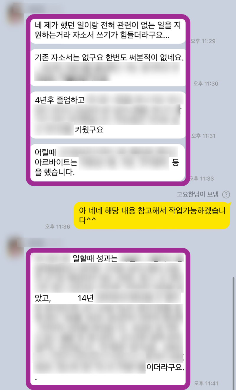 저는 여러분의 강점을 으로 끌어올려, 합격으로 향하는 가장 빠른 길을 제시합니다. 자기소개서 첨삭, 대필, 면접 컨설팅까지, 취업의 모든 과정을 함께 하겠습니다. 지금 바로 문의하세요! 이건 거의 대필 수준으로 갈아엎었어요! 고객님이 전에 쓰셨던 자소서를 들고 오셨는데, 글자 수도 안 맞고 문장도 그대로 첨삭하면서 거의 다시 짰다고 봐야 해요 제발 다음엔 하루 전에는 와주셔요..! 진짜 그래야 저도 여유 있게 도와드릴 수 있거든요