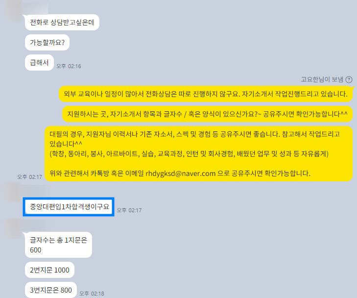 최종본을 받아보신 지원자분과 함께 하나하나 꼼꼼하게 검토하며, 혹시라도 놓친 부분은 없는지, 더 개선할 부분은 없는지 확인했습니다. 지원자분께서도 만족하시며 좋은 결과를 기대할 수 있었습니다!