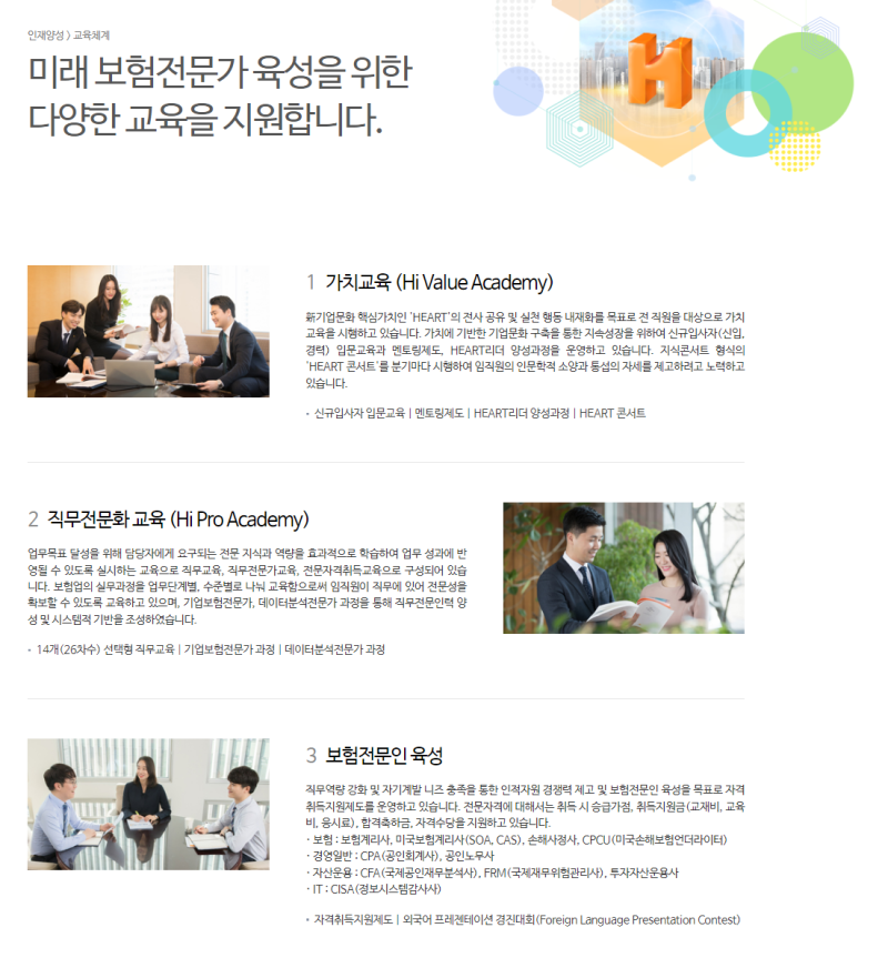 ▲ 고객과 사회를 존중하는 인재: 고객의 입장에서 생각하고 사회적 책임을 다하는 윤리적인 인재 - 주요 사업 분야: 자동차보험, 장기보험, 일반보험(화재/해상/특종), 퇴직연금 및 자산운용, 그리고 최근에는 마이데이터 및 헬스케어 등 디지털 신사업 확장