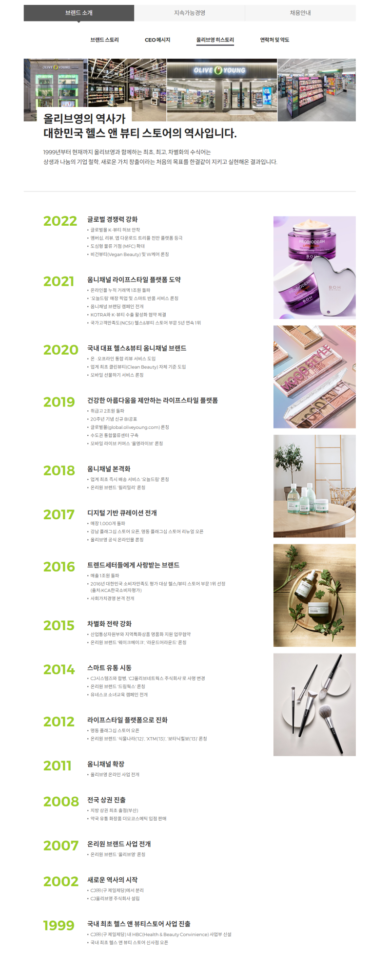 • 핵심가치: 정직, 열정, 창의, 상생 (CJ그룹 공통 가치와 더불어 올리브영만의 사업 특성이 반영됩니다.)