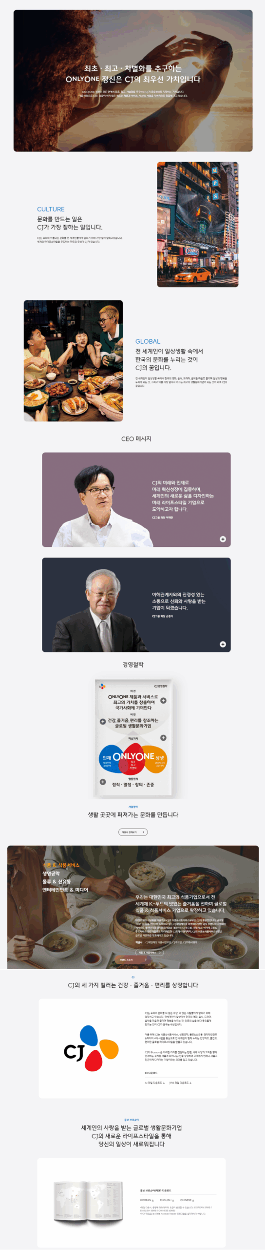 CJ는 특히 식품 산업의 글로벌 리더로서 K-푸드 확산에 앞장서고 있으며, 바이오 분야에서도 혁신적인 기술력을 바탕으로 시장을 선도하고 있습니다. 📝 기업의 핵심 가치인 ‘ONLYONE’은 모든 사업 분야에 걸쳐 혁신과 차별화를 추구하며 끊임없이 발전하는 원동력이 됩니다.