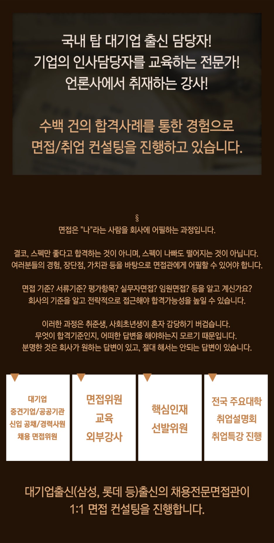 - >> 1:1 심층 상담 (온라인/오프라인으로 지원자님의 강점과 경험을 파악합니다. 🗣️)